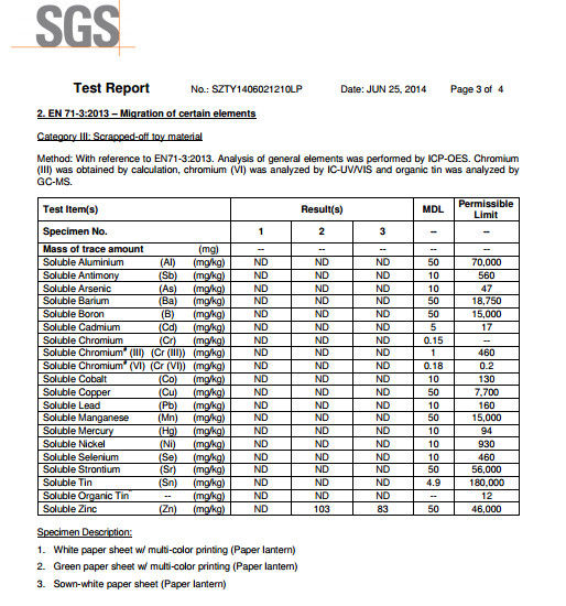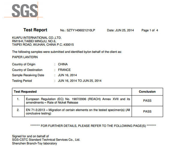 Standard:LANTERN TEST REPORT Number:SZTY1406021210LP Issued By:SGS |